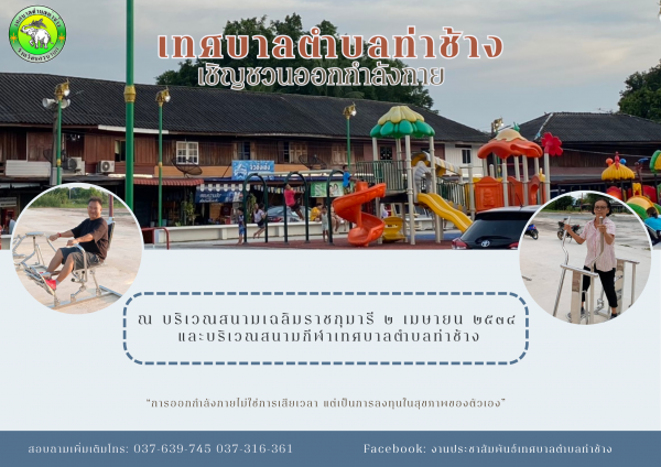 เทศบาลตำบลท่าช้างขอเชิญชวนเด็กและเยาวชน ผู้สูงอายุ ออกกำลังกาย ณ บริเวณสนามเฉลิมราชกุมารี 2 เมษายน 2534 และบริเวณสนามกีฬาเทศบาลตำบลท่าช้าง เพื่อสุขภาพร่างกายที่สมบูรณ์แข็งแรงและพบกับเครื่องเล่นใหม่ล่าสุดได้แล้ววันนี้
