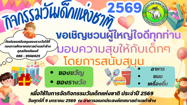 ขอเชิญร่วมสนับสนุนของขวัญ ของรางวัลต่างๆ อาหารและขนม หรือ ของใช้ต่างๆที่มีประโยชน์กับเด็กๆ เนื่องในกิจกรรมวันเด็กแห่งชาติ ประจำปี 2569